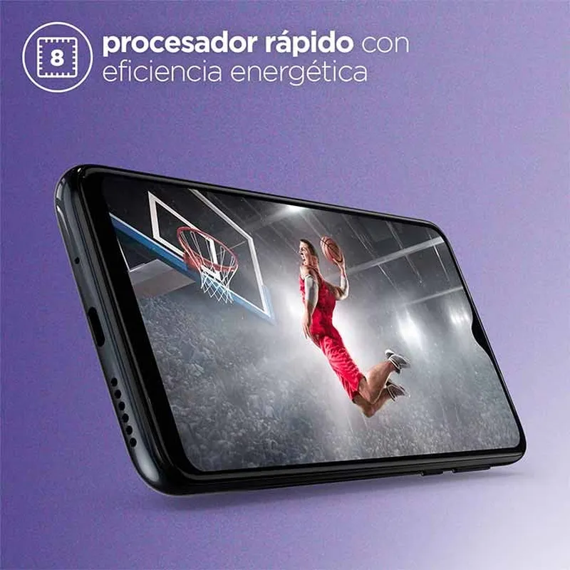 Celular MOTOROLA con pantalla IPS de 6,2 HD+, almacenamiento 64 GB, memoria RAM 4 GB, cámara 13 Mpx, batería de 4000 mAh, color azul|morado, ranura para tarjetas. A continuación las especificaciones del producto: